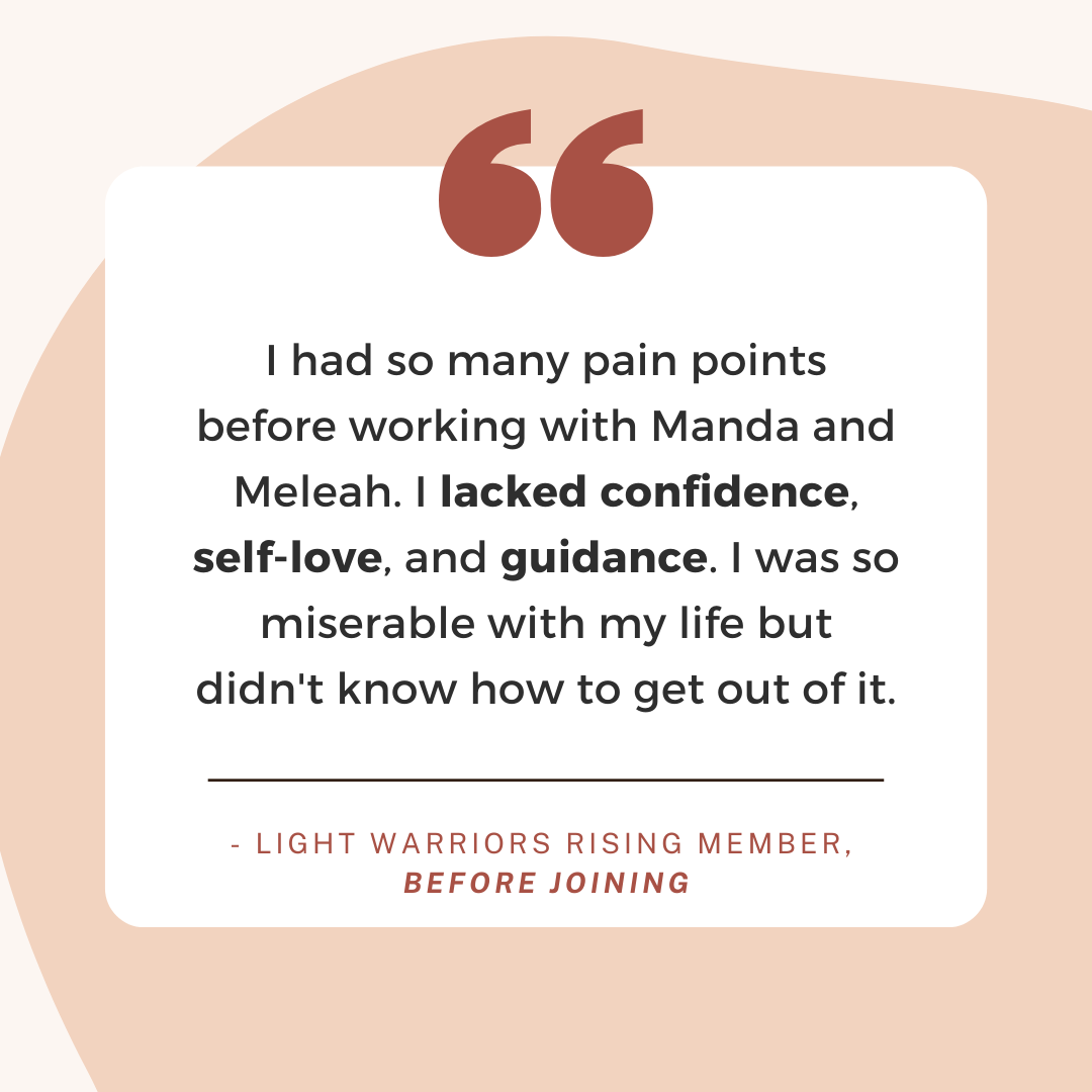As a bonus of being a Light Warriors Rising Member, you have constant support right at your fingertips via our membership community space. Within this space you will have direct access to Manda and Meleah and the other members, giving you a chance to ask questions, get feedback, share your process, and receive additional value within the community group.